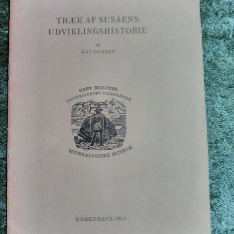 Træk af Susåens udviklingshistorie, Kaj Hansen, emne: naturvidenskab, Udgivet af grev Moltkes Universitet tilhørende Mineralogiske Museum 1954, heftet bind, pæn stand, indeholder billeder. 10 sider.