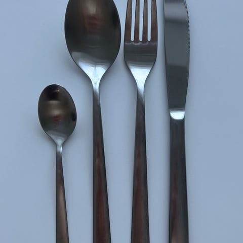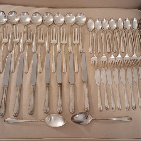 Bestik stammer fra WMF Patent 90- og 45-linjen i rombe (skeer og gafler) samt WMF Friodur (knive – hærdet stål, usædvanligt holdbart), fremstillet af tykt sølvplet af prøve 90.