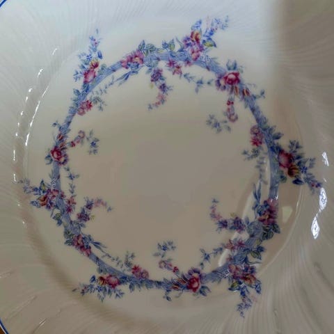 Den elegante og tidløse dekoration præsenterer flerfarvede blomstermotiver, beriget med stiliserede fugle, klogt fordelt på de forskellige elementer, med guldstriber, der pryder helheden og understreger det håndværksmæssige kvalitetsniveau.