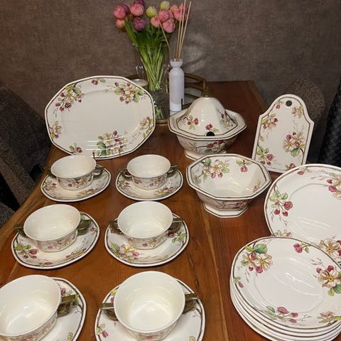 Service til 12 personer (med matchende service) Retro-Vintage – I eksklusiv fransk porcelæn fra SOLOGNE i fin, ultrablødende porcelæn, der fremhæver et abstrakt mønster i jordfarver og sort på en ultra hvid baggrund. Sidst i 1960'erne til begyndelsen af 1970'erne. Ulasteligt stand, som nyt, med ultrablødt finish!