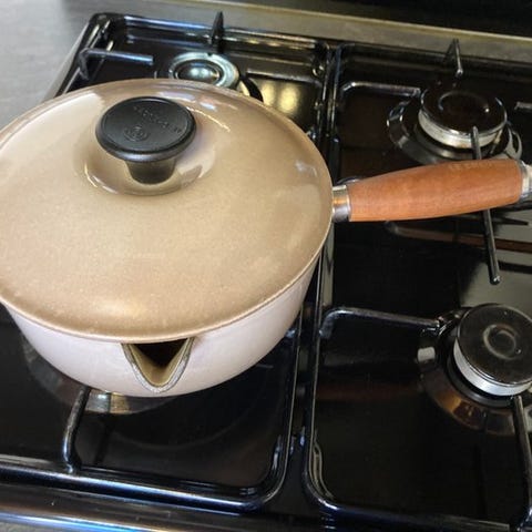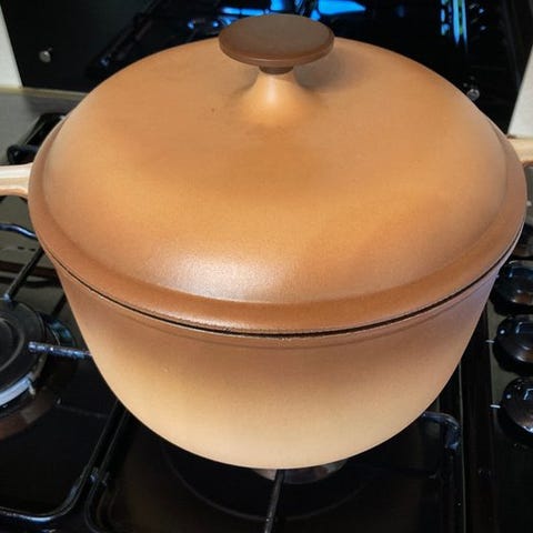 Jeg foreslår denne ovale emaljerede støbejærsgryde fra Le Creuset, en del af den berømte kollektion 'La Mama', model nr. 25, designet af den italienske designer Enzo Mari.
