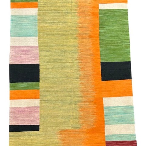 tyrkisk håndvævet designer kilim – samlerstykke, måler 212 × 155 cm, uld på uld, i meget god stand og professionelt rengjort. Klik på den blå "gå til varen" knap, for at købe eller byde på denne vare. Den samlede pris vil blive vist inden du afgiver dit bud.