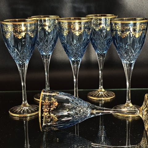Artemisia: 6 champagneglas og mousserende vine generelt, i højkvalitetskrystal, dekoreret med blondereffekt, i 24 kt. guld i azurblå farve.