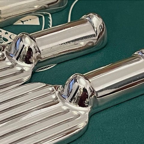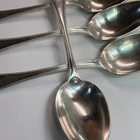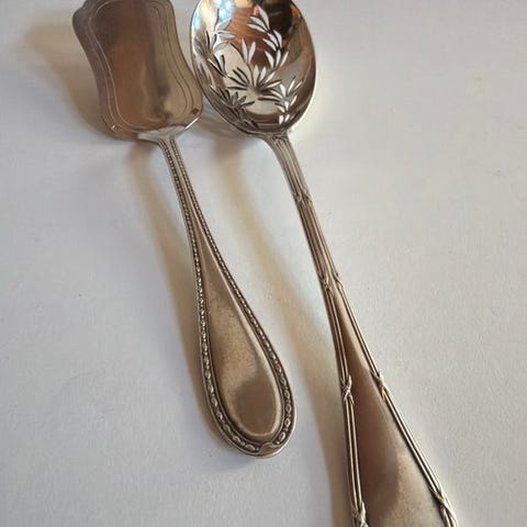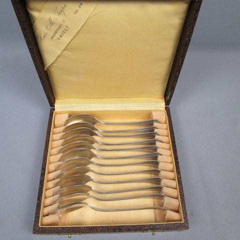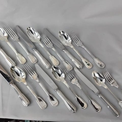 Sæt af seks skeer model Boreal, designet af Luc Lanel for Christofle, og to tandstikholdere fra Christofle, sølvbelagt, fra omkring 50'erne/60'erne.