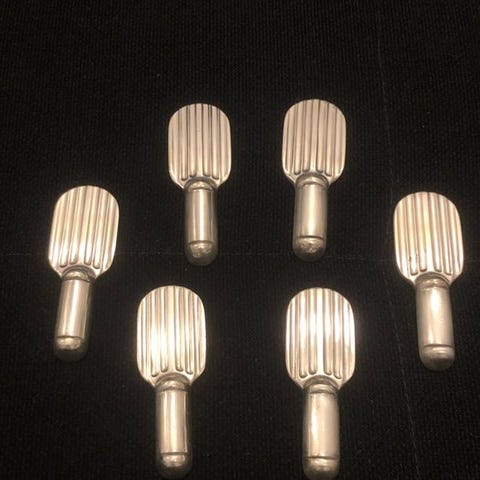 Fire sølvbelagte Gallia knivholdere i dyreform. Største 10,7 cm x 1,9 cm x 2,2 cm, samlet vægt 217,4 g.