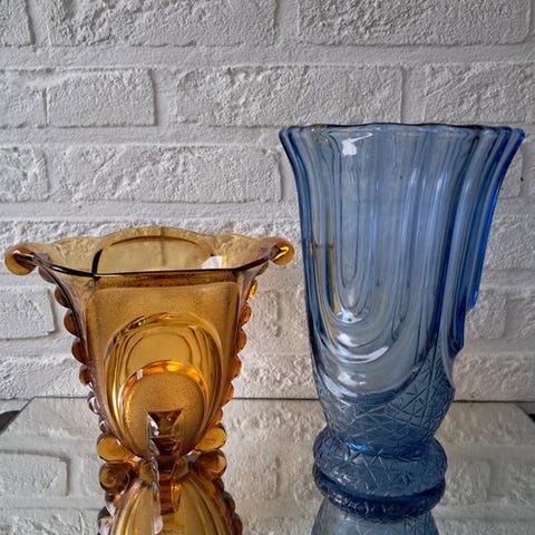 Sjælden Val Saint Lambert Luxval Panier Cyclamen (1935) glaskurv i aquamarin halvkristal, i fremragende stand, designet af Charles Graffart og René Delvenne og registreret i Moulures Fantaisies-katalogen, mål 230 mm højde, 195 mm bredde, 140 mm dybde, vægt 886 g. Klik på den blå "gå til varen" knap, for at købe eller byde på denne vare. Den samlede pris vil blive vist inden du afgiver dit bud.