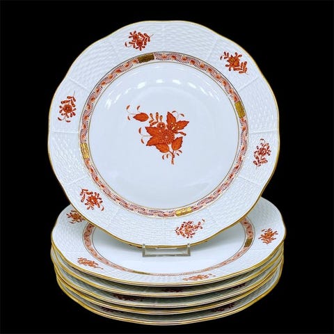 12 tallerkener Herend model Apponyi Green, hvid farve med grøn blomsterbuket-motiv og guldkanter.