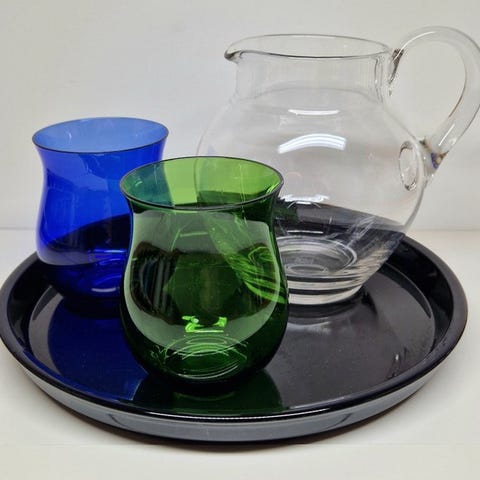 Disse smukke Wilhelmina-kopper i smukke lilla og blå farver er blevet støbt i 1923 ved Glasfabrikken i Leerdam efter design af A.D. Copier.