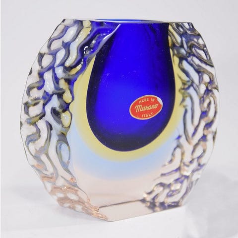 Smukke sjældne uforringede 'tre farver!' Sommerso sæt vaser ca. 21 x 8,5 cm, smukt facet-slebet, og en blokvase på 15 cm i højden, begge vaser i de tre farver rubinrød, ravgul og gennemsigtig blå.