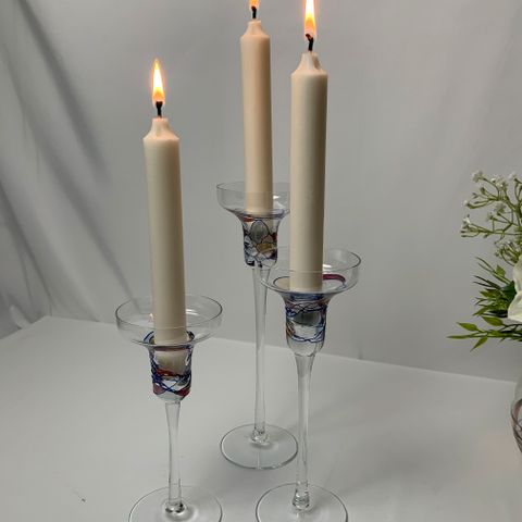 Lysestagerne har et klassisk, fluted kolonnedesign med en bred, cirkulær fod, inspireret af neoklassiske former. Deres proportioner, vægt og krystalklarhed er karakteristiske for Tiffany & Co.s produktion fra slutningen af det 20. århundrede.
