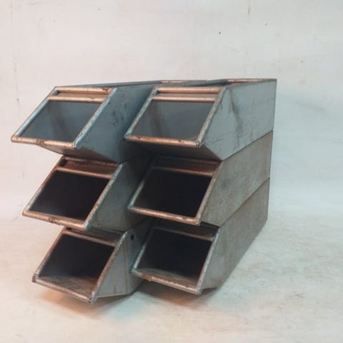 6x stabel bak, meget smuk set patina, smuk grå i farven, kommer fra en metalfabrik.