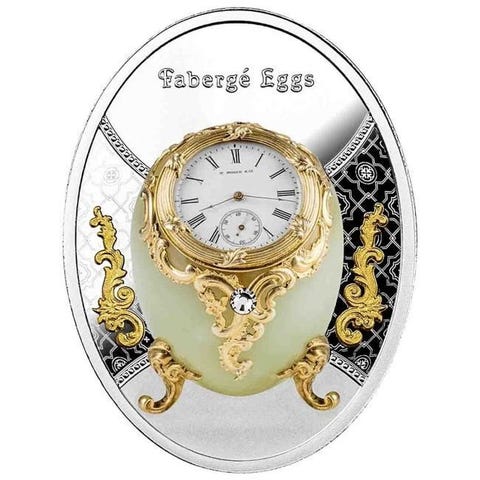 Drømmen for enhver samler – symboler på prestige og luksus, der når svimlende priser ved auktioner. Europæiske konger drømte om produkterne fra det berømte House of Fabergé. De bedste juvelérkunstnere, der arbejdede der, lavede kongelige insignier, smykker og, frem for alt, de legendariske påskeæg. En sølvmønt med en trofast gengivelse af en eksklusiv gave vil helt sikkert glæde kunst- og historieelskere.