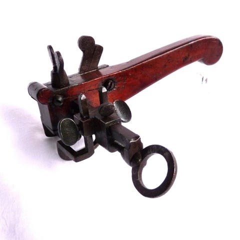 Det er en gammel vægt, sandsynligvis i jern eller bronze, brugt med en stadera-vægt.