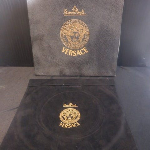 Rosenthal Versace billedramme fra Versace Frames-kollektionen i bilaminert sølv, ydre mål 27×33 cm, indre mål 18×24 cm, vægt 1,3 kg, ny i originalforseglet emballage med certifikat (artikelnummer 69079 – 321345 – 05734). Klik på den blå "gå til varen" knap, for at købe eller byde på denne vare. Den samlede pris vil blive vist inden du afgiver dit bud.