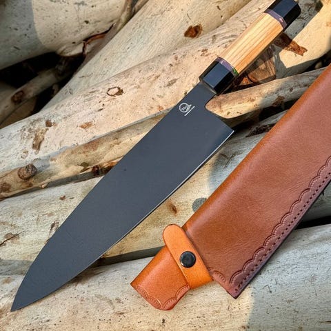 Lædercover inkluderet – et håndsyet, beskyttende hylster, der beskytter bladet og tilføjer et luksuriøst præg, hvilket gør det til en ideel gave til kulinariske entusiaster, professionelle kokke eller enhver, der