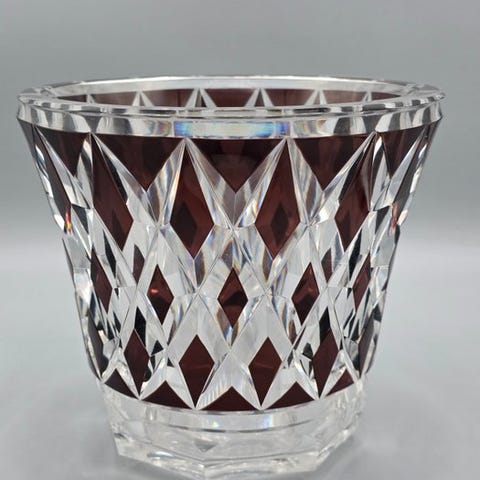 Vasen er udført i klart krystal med et dybt rødt overfang, rigt og skarpt slebet i et elegant vertikalt mønster.