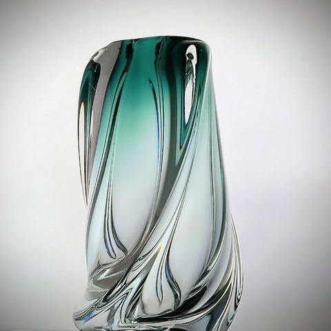 Denne vase med navnet 'VATEL' blev designet af René Delvenne og fremstillet af Val Saint Lambert i Belgien omkring midten af det sidste århundrede. Det snoede design ses regelmæssigt på vaser fra denne talentfulde designer. Der kan aldrig være to ens håndlavede vaser, hvilket gør hver enkelt unik! Bunden måler 8 cm og udvider sig til 17 cm øverst. Den nederste del af vasen er klar krystal, delikat tonet i pink, der gradvist bliver dybere og eksploderer i en smuk dyb tranebærrød mod toppen. Meget smuk!
