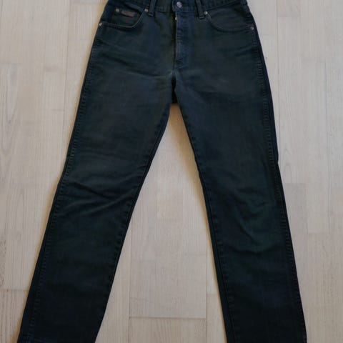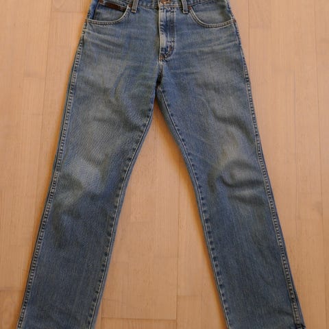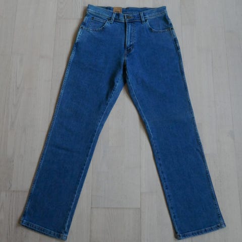 Wrangler herrejeans i blå farve, størrelse W31 og M. Fremstillet i bomuld. Jeansene har klassisk design med lommer foran og bagpå samt synlige syninger.