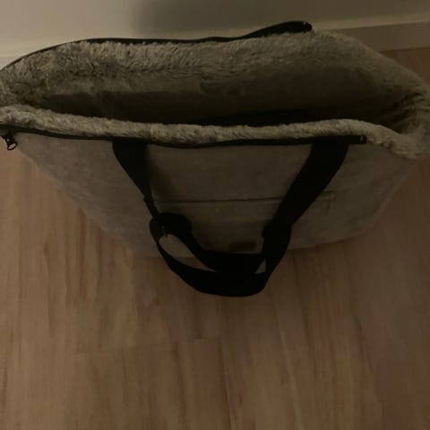 Transportabel hundetaske i grå og sort farve med netvinduer til ventilation. Tasken har en rektangulær form og bærerem for nem transport. Kun pakket ud og aldrig brugt.