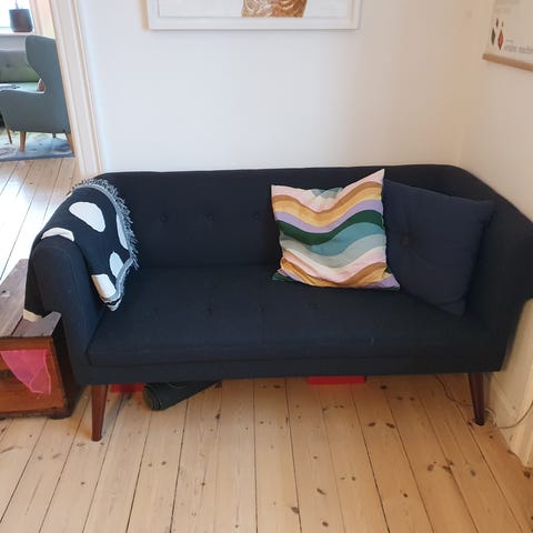 Sofa i petroleumsblå fra Sofacompany. Sofaen holder rigtig fint form i skummet, og fejler ikke noget som sådan. Men den er slidt, og trænger nok til en afrensning af betrækket.