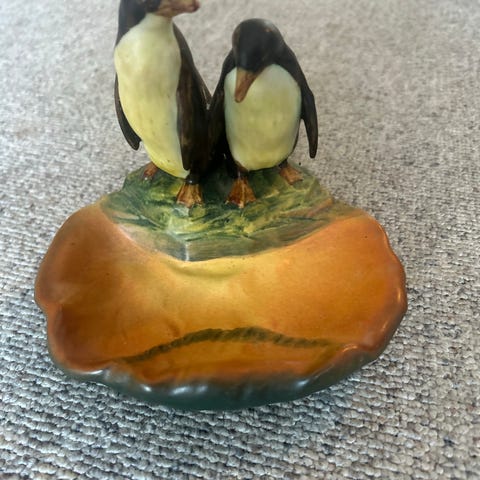 P. Ipsens enke 1927. Den ene pingvin har en næsten usynlig ræven i næbet. Den er lavet af Teracotta