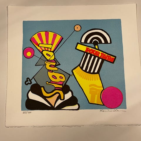 Karin Olesen grafiktryk nummereret 63 ud af 100. Farverig illustration med forskellige geometriske former og tekst, trykt på papir med ujævne kanter. Mål: L 38,5 x H 35 cm.