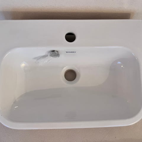 Duravit Happy D.2 håndvask, 50x40 cm, hvid. Aldrig brugt, da den desværre ikke passede i målene til vores badeværelse. Der medfølger en keramisk push-open bundventil, som giver et super flot look. Ny pris: 4.399. Se alle specifikationer her: https://www.billigvvs.dk/duravit-happy-d2-haandvask-50x40-cm-hvid-2428870#product-description. Vi har også en lille vask til salg.