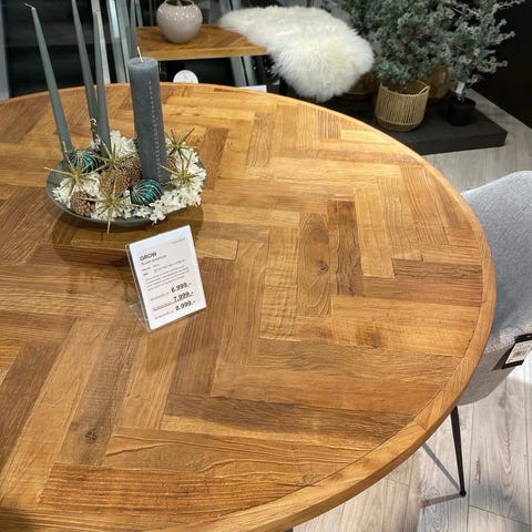 Rundt spisebord med bordplade i træ og stel i sort metal. Passer til spisestue eller køkken. Bordet har en naturlig træfarve og et robust metalstel for stabilitet. Købt hos sit’n sleep - nypris 14.000. Evt smid et bud
