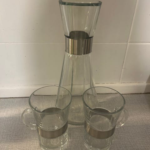 IKEA glas karaffel i klart glas med metalindsats. Karaffelen er designet til opbevaring og servering af drikkevarer.