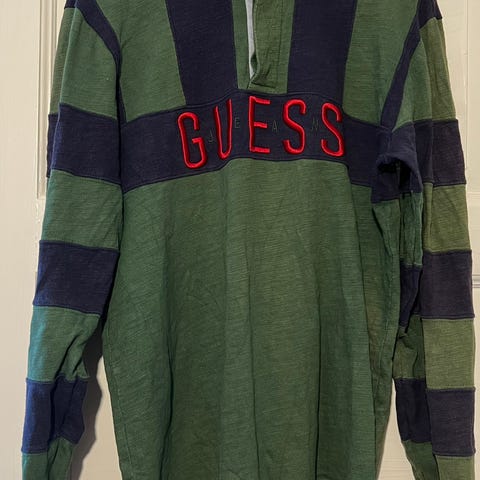 GUESS herrebluse i størrelse L, men passer M (se billeder) , blå farve med grå ærmer. Blusen har rund hals og er designet til mænd.
