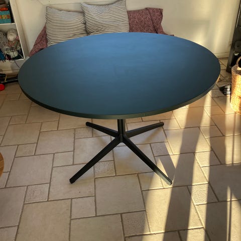 Flot spisebord/mødebord petroliumsgrøn bordplade monteret på sort elypison stel.