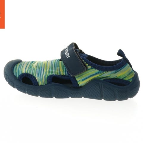 Et par badesko med en rød og hvid ternet tekstiloverdel. Skoene er dekoreret med røde flæser og har et lille sort hjerte detalje på tåen. Sålene ser ud til at være lavet af et lysegult gummimateriale, og der er træk i hælen for nem påtagning. Størrelsen er 26-27.