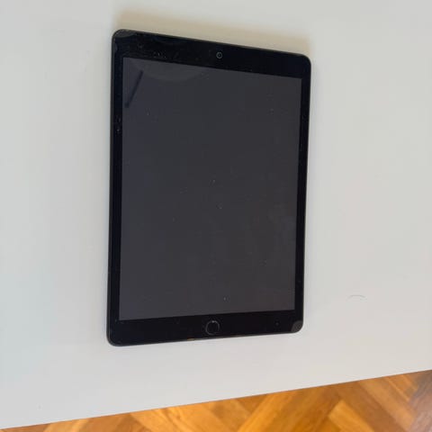 Denne iPad fra Apple har en størrelse på 24x18,5 cm og kommer med en oplader. Den har en metal bagside med et sort Apple logo og skærmen har mærker efter brug. En hvid opladningskabel er inkluderet med en adapter til stikkontakten. Den kan bruges til browsing, apps, og spil.