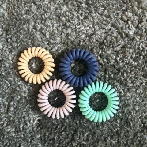 Denne samling indeholder flere forskelligt farvede spiralelastikker, der anvendes til at binde hår. De medfølgende elastikker er i farver som sort, blå, pink, gul, hvid og rød. Elastikkerne leveres med en lille, rød opbevaringspose med lynlås for nem opbevaring og transport.