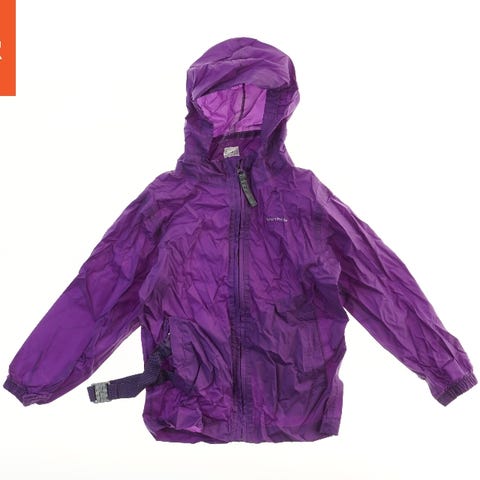 Jakken er blå og har en hætte. Den har en lynlås foran, der spænder hele vejen op til hætten. Der er synlige sømme, og bagsiden af jakken har ingen lommer. Jakken ser ud til at være lavet af vandafvisende materiale.