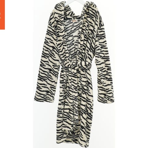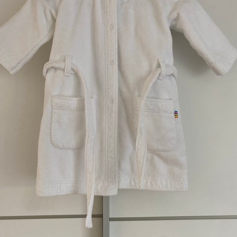 Denne badekåbe er blå og har en hætte. Den har et bælte i matchende farve og lommer på forsiden. Der er et mærke 'Watko' broderet på brystområdet og øverst på ryggen.