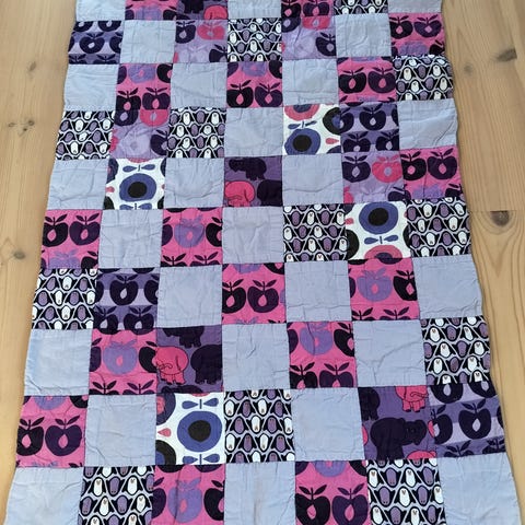 Babytæppe patchwork, med fleecebagside. Mål ca 115 x 80 cm