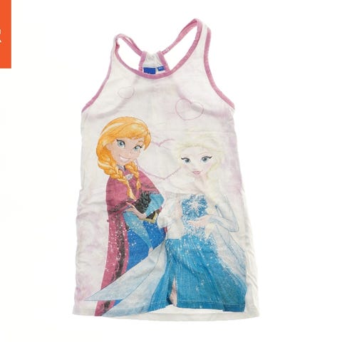 Natkjole med lange ærmer og motiv af Elsa fra Disney's Frozen. Kjolen er primært grå med et stort, farverigt tryk af Elsa i en blå iskjole og snefnug. Bagsiden er enkelt uden dekoration.