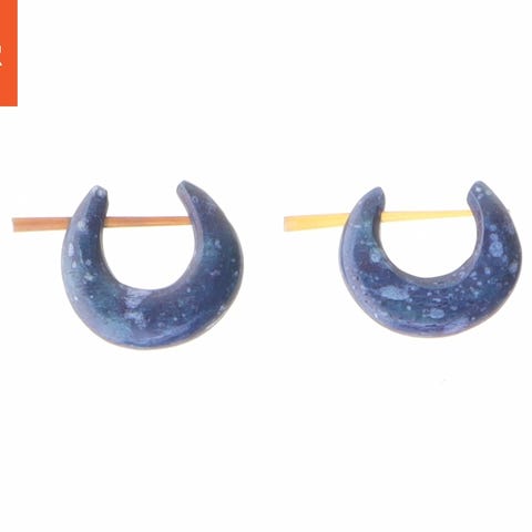 Dette er et par små ørestikker, hver måler 2,5 cm i længde. De er lavet af sort materiale og har et indlagt design med små skaller. Ørestikkerne har en unik form med en åbning i toppen for at sætte dem fast i øret. De har en naturlig og organisk æstetik der gør dem ideelle til dem der ønsker et naturnært look.