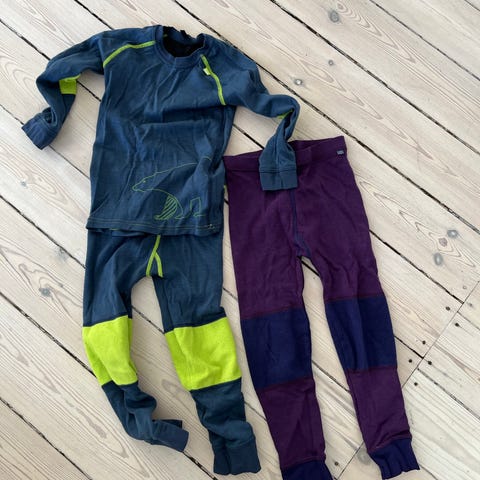 Helly Hansen skiundertøj i størrelse 116, sort med røde kanter. Fleece for på knæ, så det ikke kradser.