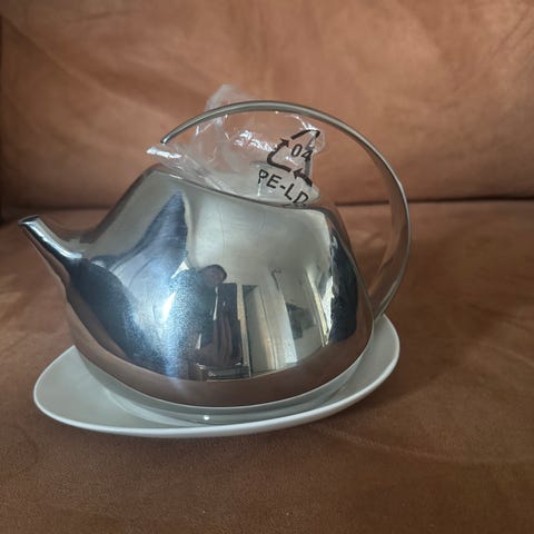 Georg Jensen tekande med tilhørende fad, sukkerskål og tebeholder. Produkterne er fremstillet i en kombination af rustfrit stål og hvidt porcelæn.