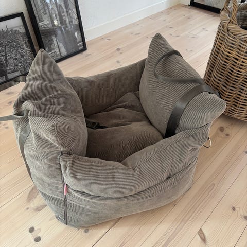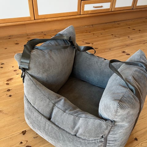 Hundesæde med div seler til fastspænding. Til lille hund. Brugt i 14 dage.
