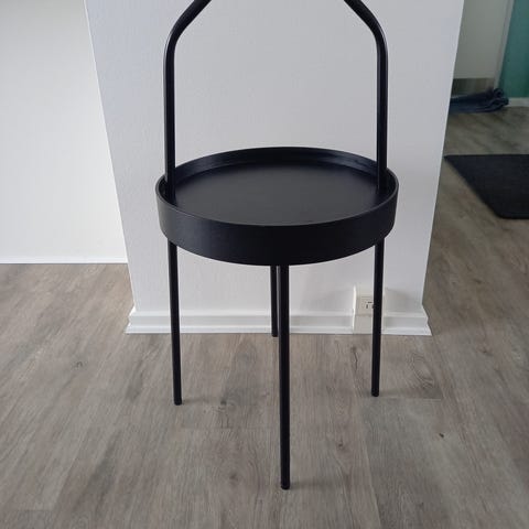 Sort metalbakke på metal stel. Kan klappes sammen så det fylder fylder meget. Mål: 47x51 cm