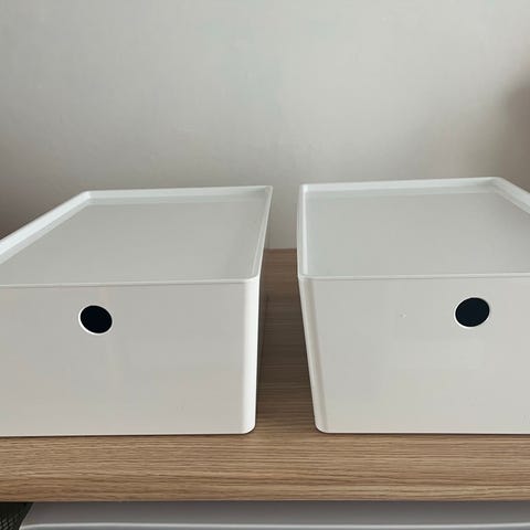 Jeg sælger 6 stk. IKEA KUGGIS opbevaringskasser med låg i hvid. Kasserne sælges kun samlet.