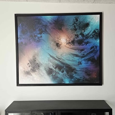 Billedet måler 184x104 inkl. sort svævende ramme. Fremstår som nyt uden skrammer eller andre beskadigelser. Perfekt til at give lidt farver i hjemmet.