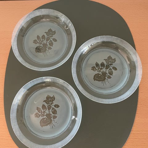 Smukke glas tallerkener assietter til dessert eller kager. Der 11 stks og er håndlavet/mundblæst. Man kan se det på glaskanten der kan være mindre forskelle på. Viser de ikke er masseproduceret:) Priside 50 stykket. Byd.