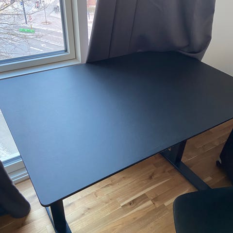 Flexispot El-skrivebord i L-form med sort bordplade. Skrivebordet har elektrisk højdejustering og en stor arbejdsflade, der giver plads til flere skærme og tilbehør. Bordet er velegnet til kontorbrug eller gaming og kan tilpasses i højden for ergonomisk komfort.