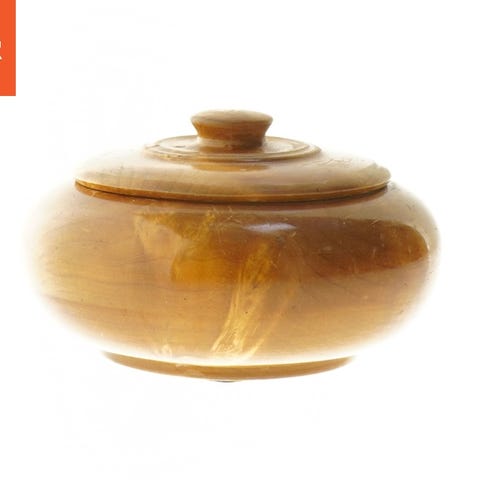 Denne genstand er en rund havekrukke lavet i keramik. Den fremstår i en mørk farvetone og er udsmykket med to parallelle bånd, der omgiver krukken. Bunden af krukken har en etiket med et nummer trykt på. Krukkens dimensioner er Ø 20x16,5 cm.