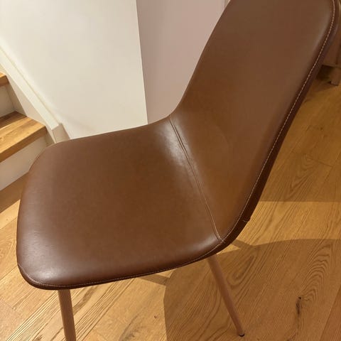 5 spisesbordsstole med polstret sæde og ryglæn i cognacfarvet kunstlæder. Benene er i stål med egetræslook. Fraset en af dem, hvor betrækket er en smule løst ved det nederste af rygstykket, hvilket ikke bemærkes, så er øvrige som nye. Det er behagelige stole at sidde i og med et enkelt design.