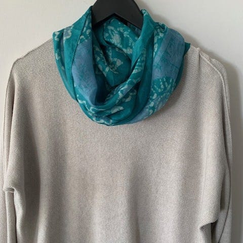 Dette tørklæde er lavet af silke og har et dekorativt design med bambusmønster. Det måler 90x90 cm og kan bruges som et stilfuldt accessorie til forskellige outfits. Farverne i mønsteret inkluderer blå, lilla og grønne nuancer, hvilket giver tørklædet et elegant udseende.